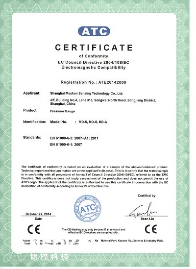 2014年10月,新款的MD-S280數(shù)字壓力表/MD-S200數(shù)字壓力表通過ATC實驗室CE認證。